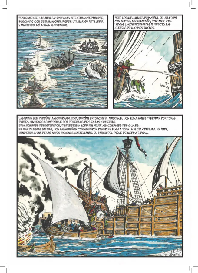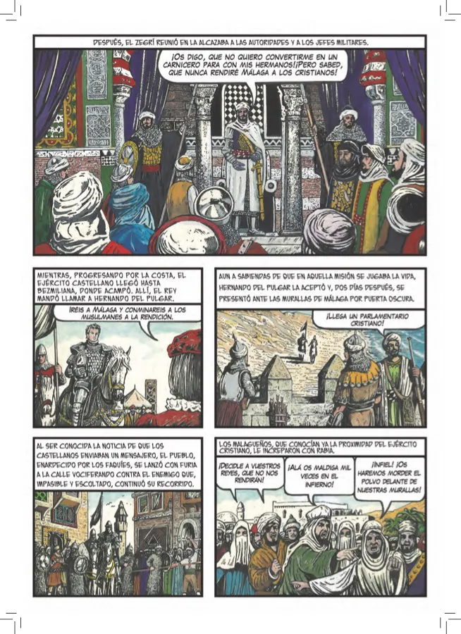 1487: LA CONQUISTA DE MÁLAGA fue publicado por primera vez, y en blanco y negro, en diciembre de 1993, cumpliéndose en 2025 los treinta y dos años de aquella edición. Por entonces, los jóvenes de nuestra capital, en general, desconocían a personajes como El Zegrí o Hernando Pérez del Pulgar, tampoco las vicisitudes del cerco de Málaga por parte de las huestes de los Reyes Católicos (lo experimenté porque, en aquel tiempo, ejercí la docencia). En todo caso, quise que la obra plasmara un respeto y comprensión hacia las religiones, islámica, hebrea y cristiana, y que el bien de la tolerancia existiera, de tal manera, que el día de su presentación había en el aforo, musulmanes, judíos y cristianos. Fue una experiencia muy positiva. Sin embargo, tanto en el relato como en las imágenes del libro, no debían sustraerse males de la época como, por ejemplo, que Dios estaba siempre a favor del bando propio. Y es que todavía habría que esperar a 1517, para que Erasmo de Rotterdam escribiera su Querela Pacis (Lamento de la Paz), y otros textos que expandieran una evolución diferente en cuanto al punto de vista del Dios “aliado”. Eran los destellos del Renacimiento. El concepto de la tolerancia no comenzó hasta el siglo XIX, con la llegada de la Declaración de los Derechos del Hombre y del Ciudadano. La libertad de creencia, opinión y expresión se convirtió en un derecho inalienable ligado a la libertad de tomar las propias decisiones y de juzgar en conciencia. Sin embargo, no debemos perder de vista, que la decisión individual de obrar en conciencia siempre ha existido, y perdurará en los seres humanos frente a las conductas generales y la imposición de los poderes; y esa conciencia, ese obrar diferente, aparece en varios personajes del libro, oponiéndose con valor al fanatismo, las supersticiones y al mal de la ignorancia imperantes.