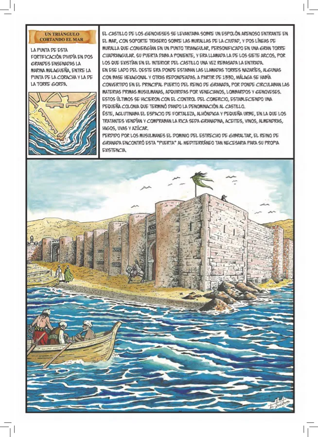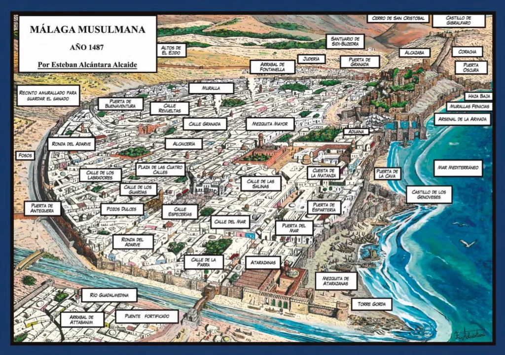 El malagueño actual puede (y este “puede” significa que aún hoy en día le es factible realizarlo si tiene suficiente interés y efectúa el esfuerzo requerido), observar unas perspectivas del Castillo de Gibralfaro y de la Alcazaba, similares a las que en este libro se reflejan y a las que vieron los Reyes Católicos en aquellos momentos cruciales, desplazándose al Monte de San Antón, al Calvario y algunos otros lugares, sin que construcciones modernas le impidan esa visión, al menos totalmente. Obviamente, la muralla, los baluartes y el interior de la ciudad, han debido ser reconstruidos idealmente, interpretando textos coetáneos y planos de época posterior, pero sin que los condicionamientos inherentes a una obra gráfica de esta naturaleza desvirtúen, en lo más mínimo, el rigor del estudio de base y las conclusiones del mismo derivadas.