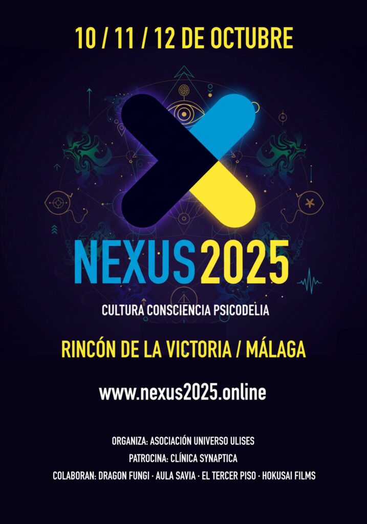 Nexus2025 es un encuentro libre, gratuito y abierto a creadores, pensadores, artistas, activistas, terapeutas, investigadores, psiconautas, curiosos y caminantes de toda índole para entretejer, entre todos, miradas y prácticas en torno a la psiquedelia contemporánea. Nexus 2025 es una iniciativa autogestionada por la Asociación Universo Ulises, con el patrocinio de Clínica Synaptica y la colaboración de Dragon Fungui, Aula Savia, El Tercer Piso de Librería Proteo y Hokusai Films.